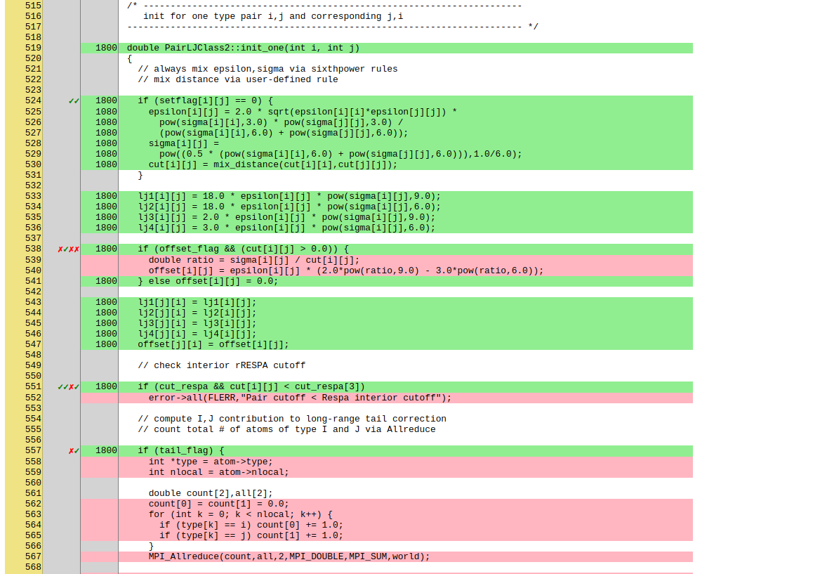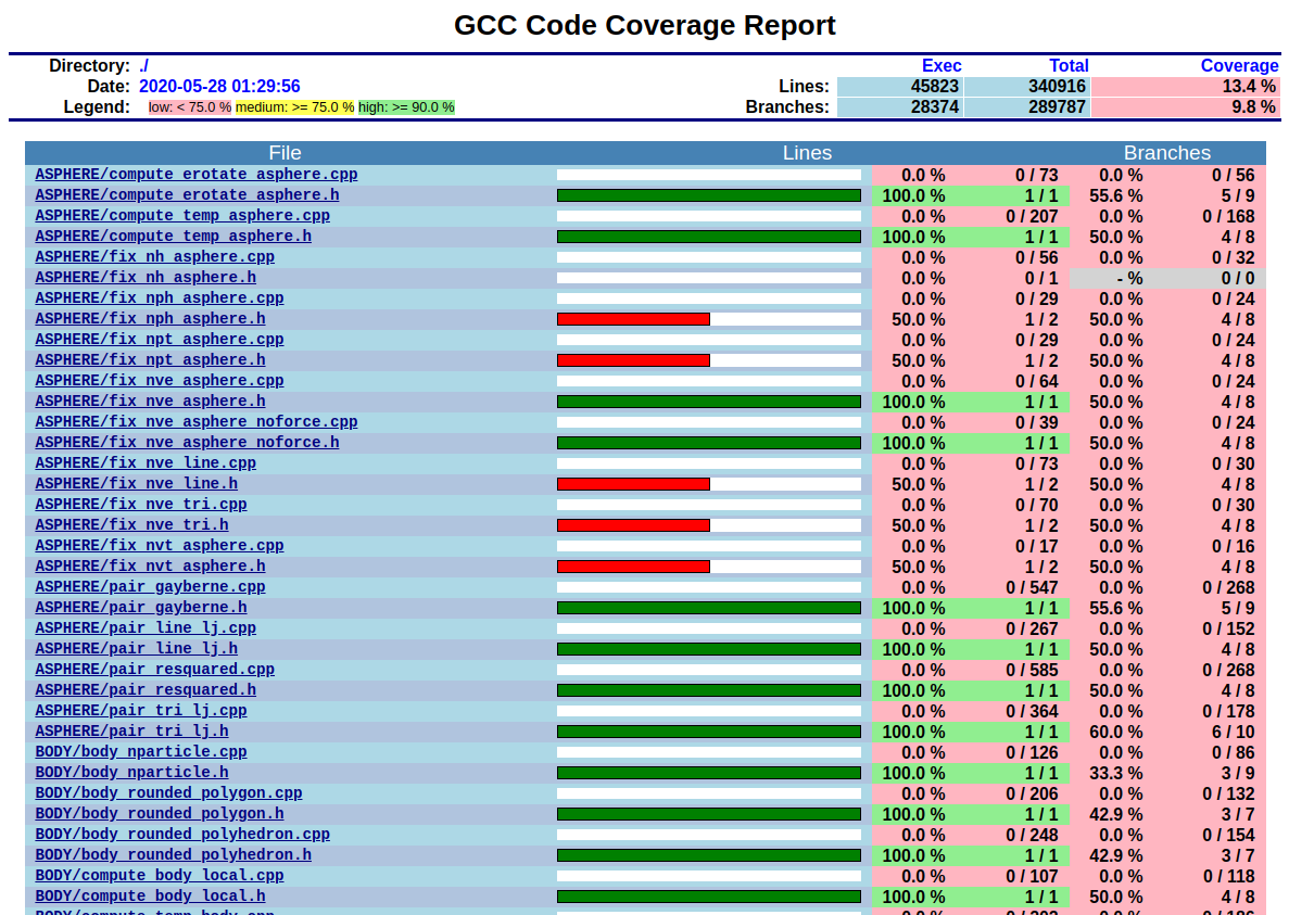 This will instrument all object files to write information about which lines of code were accessed during execution in files next to the corresponding object files. These can be post-processed to visually show the degree of coverage and which code paths are accessed and which are not taken. When working on unit tests (see above), this can be extremely helpful to determine which parts of the code are not executed and thus what kind of tests are still missing. The coverage data is cumulative, i.e. new data is added with each new run.