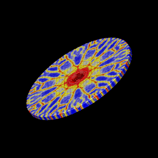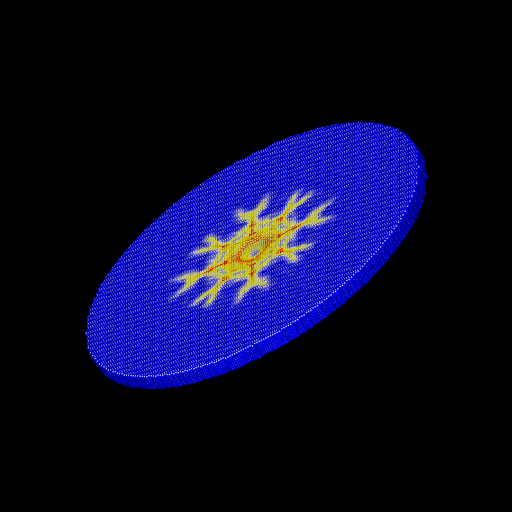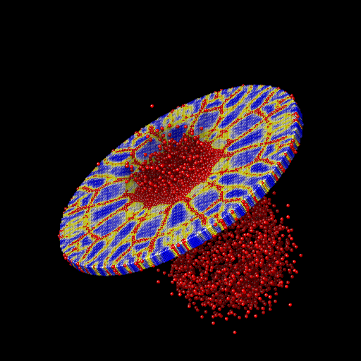 We ran the input script from above. Images of the disk (projectile not shown) appear in Figure below. The plot of damage on the top monolayer was created by coloring each particle according to its damage.